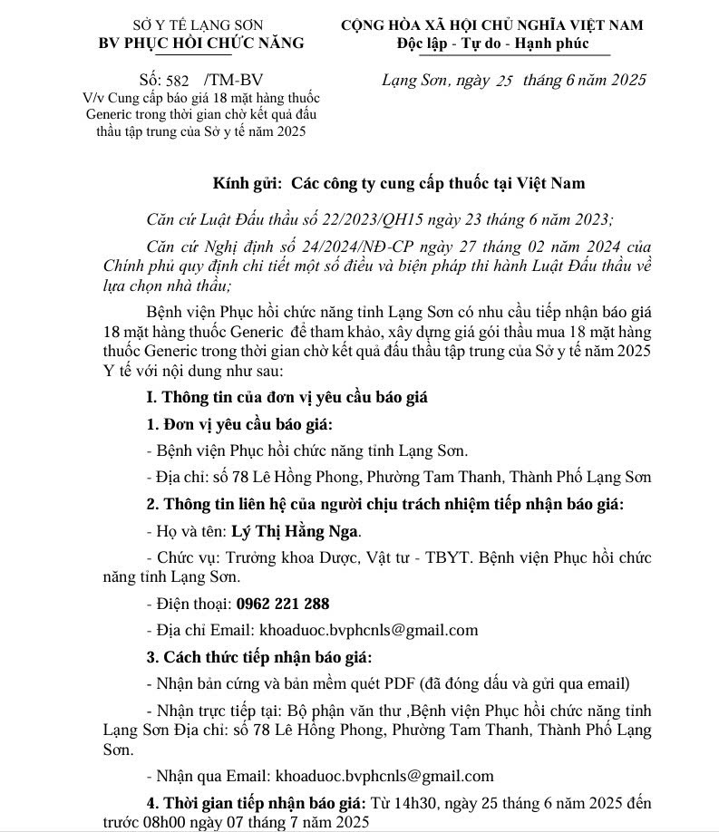 Thư mời cung cấp báo giá Dịch vụ tư vấn đấu thầu Mua vật tư y tế chờ thầu năm 2025 cho Bệnh viện Phục hồi chức năng tỉnh Lạng Sơn