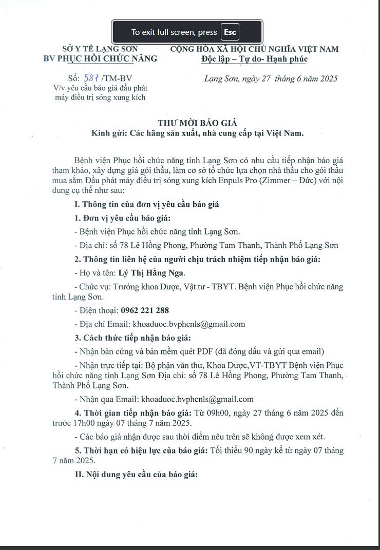 Thư mời cung cấp báo giá Dịch vụ tư vấn đấu thầu Mua vật tư y tế chờ thầu năm 2025 cho Bệnh viện Phục hồi chức năng tỉnh Lạng Sơn